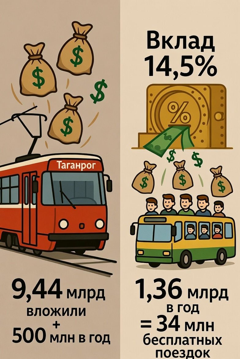 Пока концессионер «Синара» отчитывается о красивых вагонах и растущем пассажиропотоке, налогоплательщики Ростовской области гарантированно теряют полмиллиарда рублей ежегодно. Но если посмотреть на цифры холодно и цинично, возникает вопрос: а зачем вообще нужно было строить этот трамвай? Мы провели расчеты и выяснили: если бы 12 миллиардов, потраченных на модернизацию, просто положили в банк под проценты, этих денег хватило бы, чтобы возить всех пассажиров Таганрога на маршрутках бесплатно. И еще бы на такси осталось. Начнем с базы. Модернизация таганрогского трамвая обошлась в 11,84 млрд рублей . Распределение этих денег выглядит так: То есть из почти 12 миллиардов львиная доля — 9,44 млрд рублей — это государственные деньги, которые могли бы работать на людей, а не на обеспечение доходности частной компании. Сегодня, в феврале 2026 года, максимальная ставка по вкладам в крупнейших банках России составляет 14,49% годовых . Давайте представим альтернативную реальность, где чиновники в