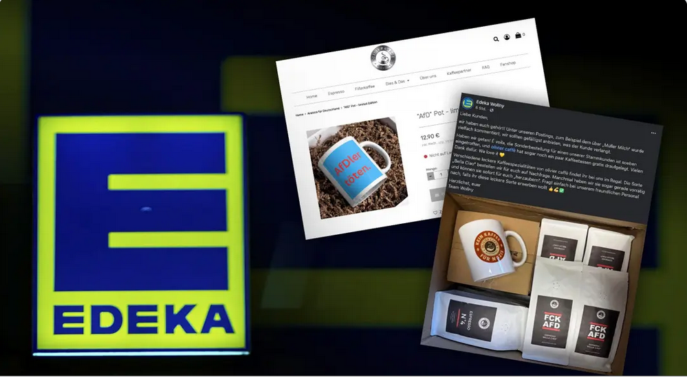 Кофейная компания «olivier caffè» из Вольфсбурга продает кофейные чашки с лозунгом «У..ть членов AfD». Эта же компания тесно сотрудничает с сетью супермаркетов Edeka. Как показывают скриншоты, полученные NIUS, супермаркет Edeka Wollny в Фридберге, Бавария, продает кофейные пакеты и чашки от «olivier caffè» с надписями «FCK AFD» и «Нет кофе для нацистов».
