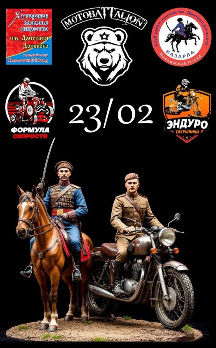 23 февраля приглашаем Вас на большое мероприятие, которое начнется ровно в 12.00 на территории Казачьего конного клуба имени Дмитрия Донского в г. Павловский-Посад. Это будет весьма необычный союз представителей Мото культуры и Казачества! Проведите этот день с пользой! Вход свободный.