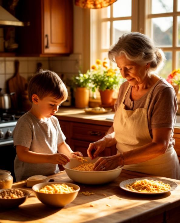 Знакомая ситуация: внуки в гостях, обед варится, а маленький помощник крутится под ногами, тянет руки к плите, капризничает или просто скучает? Руки заняты, котлеты жарятся, а ребёнку нужно внимание. Раньше я говорила: «Иди поиграй в комнате». Но внуки обижались. А потом я поняла: кухня — это же самое интересное место в доме! Здесь столько всего шуршит, гремит, вкусно пахнет. Главное — правильно организовать пространство и превратить готовку в увлекательное занятие для внуков. Дайте внуку макароны с крупными дырочками (например, перья или колечки) и толстый шнурок или верёвочку. Пусть нанизывает бусы. Что развивает: мелкую моторику, координацию, глазомер. А готовые бусы можно потом покрасить красками и подарить маме! Идея: если есть разноцветные макароны (свёкла или куркума окрасят их в разные цвета), будет ещё интереснее. Пока готовится обед, можно поиграть в дегустаторов. Положите на тарелочку маленькие кусочки разных продуктов: яблоко, огурец, сыр, хлеб, кусочек варёной морковки. З