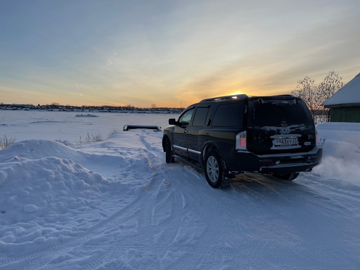Морозный вечер в Карелии на берегу реки Кемь и Infiniti QX56