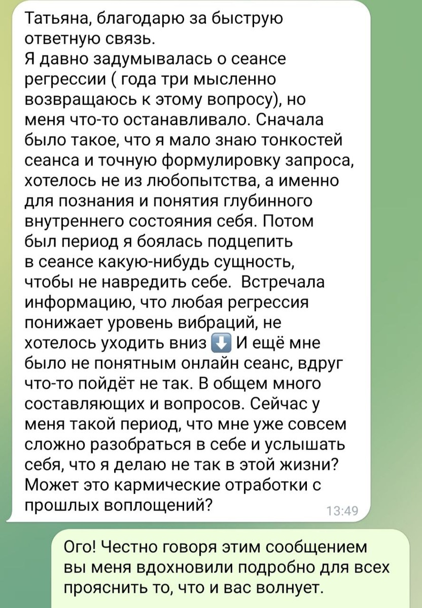 Выкладываю сообщение с разрешения клиента. Такой вот клубочек. Давайте распутываться постепенно. Я вот не знаю даже, где могла найтись такая информация, что регрессия якобы понижает вибрации 🙈 Понижение вибраций — это когда мы, попросту говоря, уходим в негатив: негативные мысли, состояния, думаем о проблемах, переживаем и в таком духе. То есть это противоположное состояние покою, радости, счастья. А что же мы делаем в регрессии? Мы работаем с состоянием, выводим его в ресурсное. Находим причины проблем и прорабатываем. Получаем ответы на то, что нас беспокоит, и рекомендации от Высших аспектов, что нам нужно сделать, чтобы лучше себя чувствовать. Понимаете? То есть априори невозможно в сеансе регрессии понизить вибрации, когда происходит как раз обратное. У меня единственное предположение, почему где-то могла повстречаться такая информация. В некоторых случаях, иногда, после интенсивной работы в сеансе регрессии, когда был проработан большой пласт и затрачено много ресурса, после се
