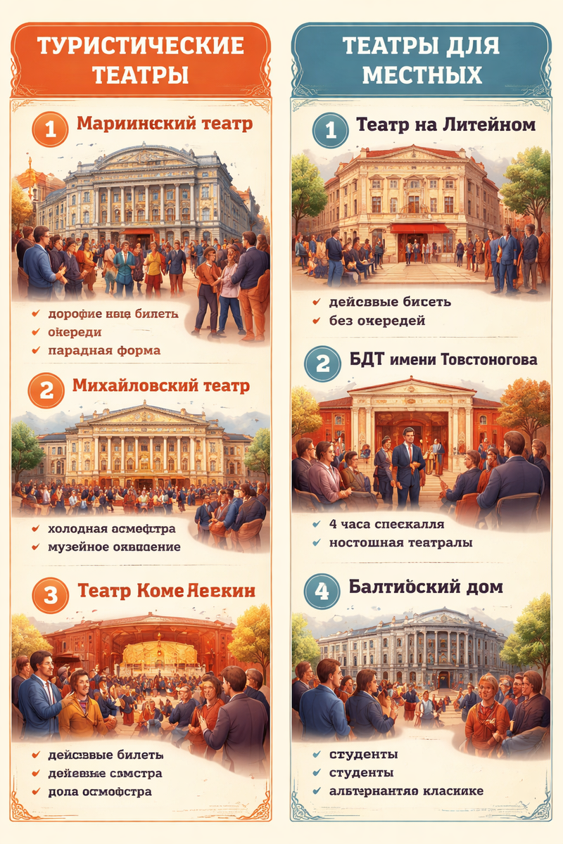 Местные редко ходят в Мариинский и Михайловский — они считают это туристическим сервисом. Они предпочитают БДТ, Театр на Литейном, Театр Комедии и экспериментальные сцены.