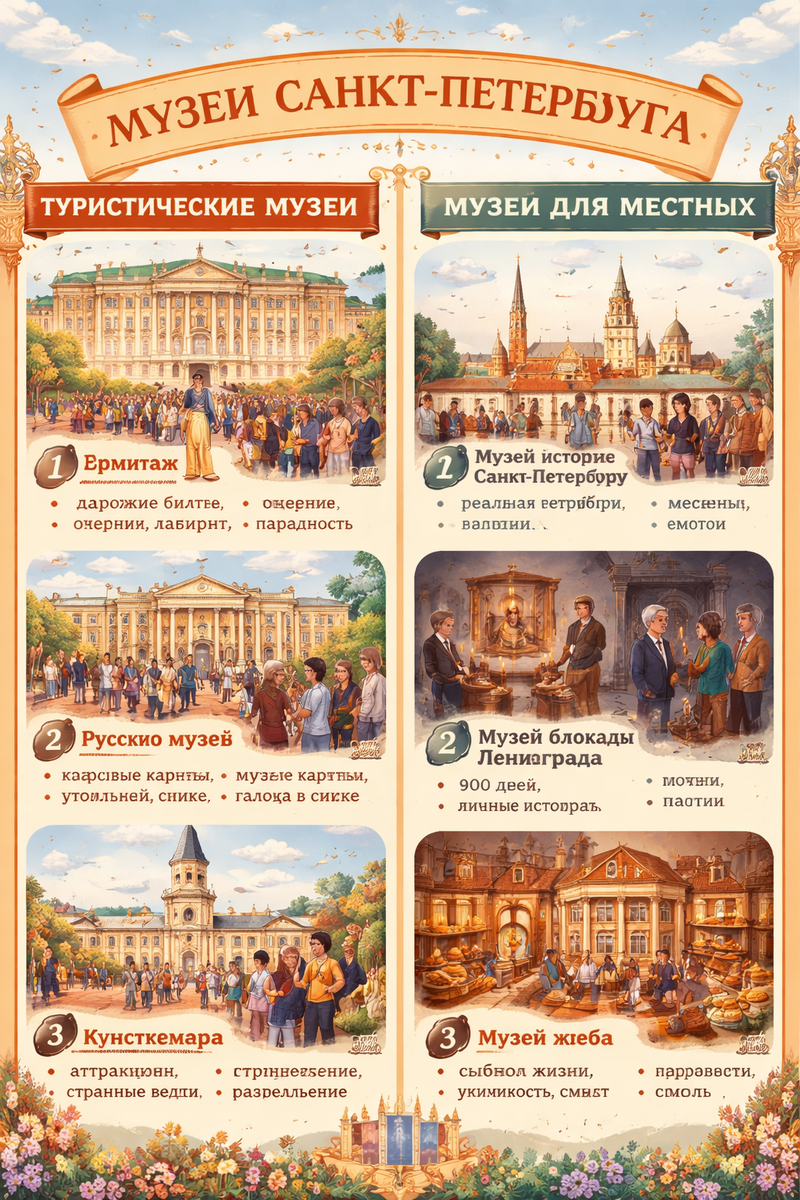 Местные редко ходят в Эрмитаж и Русский музей без повода. Они предпочитают музеи истории, специализированные музеи, которые рассказывают истории людей. Для них музей — это не место для фотографий, это место для размышлений.