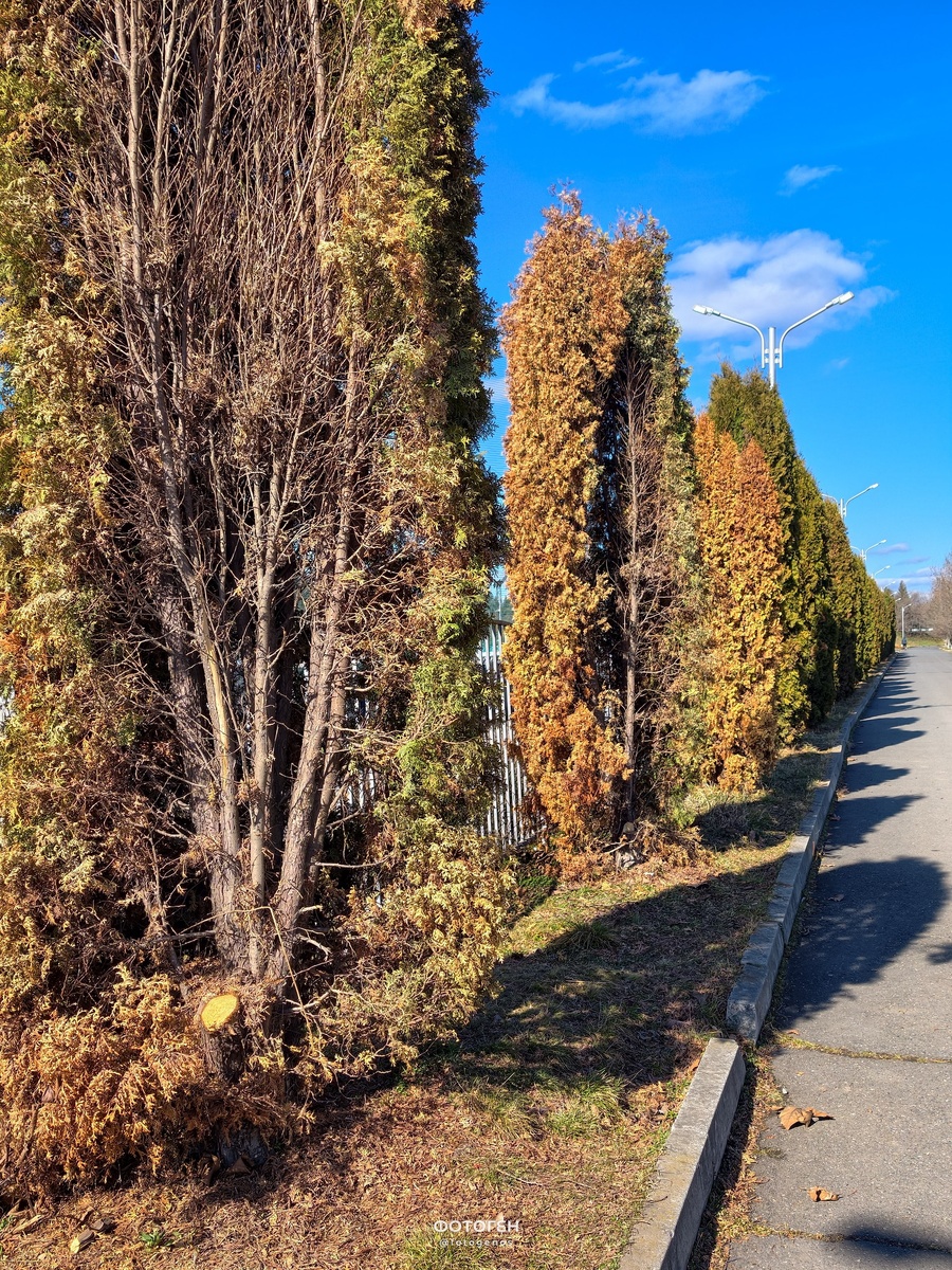 Погибли все туи на набережной. (