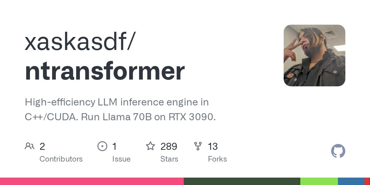 Если у вас есть RTX 3090 с 24 ГБ видеопамяти, этот проект — настоящая находка! NTransformer умеет запускать огромные модели, например Llama 70B, разбивая их на слои и транслируя через память GPU и NVMe прямо минуя CPU. Благодаря умной системе кэширования и оптимизациям скорость выросла в десятки раз. При этом нет зависимости от PyTorch — всё на чистом C++ и CUDA. Это крутая возможность работать с топовыми моделями на доступном железе, не тратясь на серверы. #машинноеобучение #искусственныйинтеллект #CUDA #LLM #NTransformer #программирование #оптимизация #GPU https://github.com/xaskasdf/ntransformer https://vlad1kudelko.github.io/