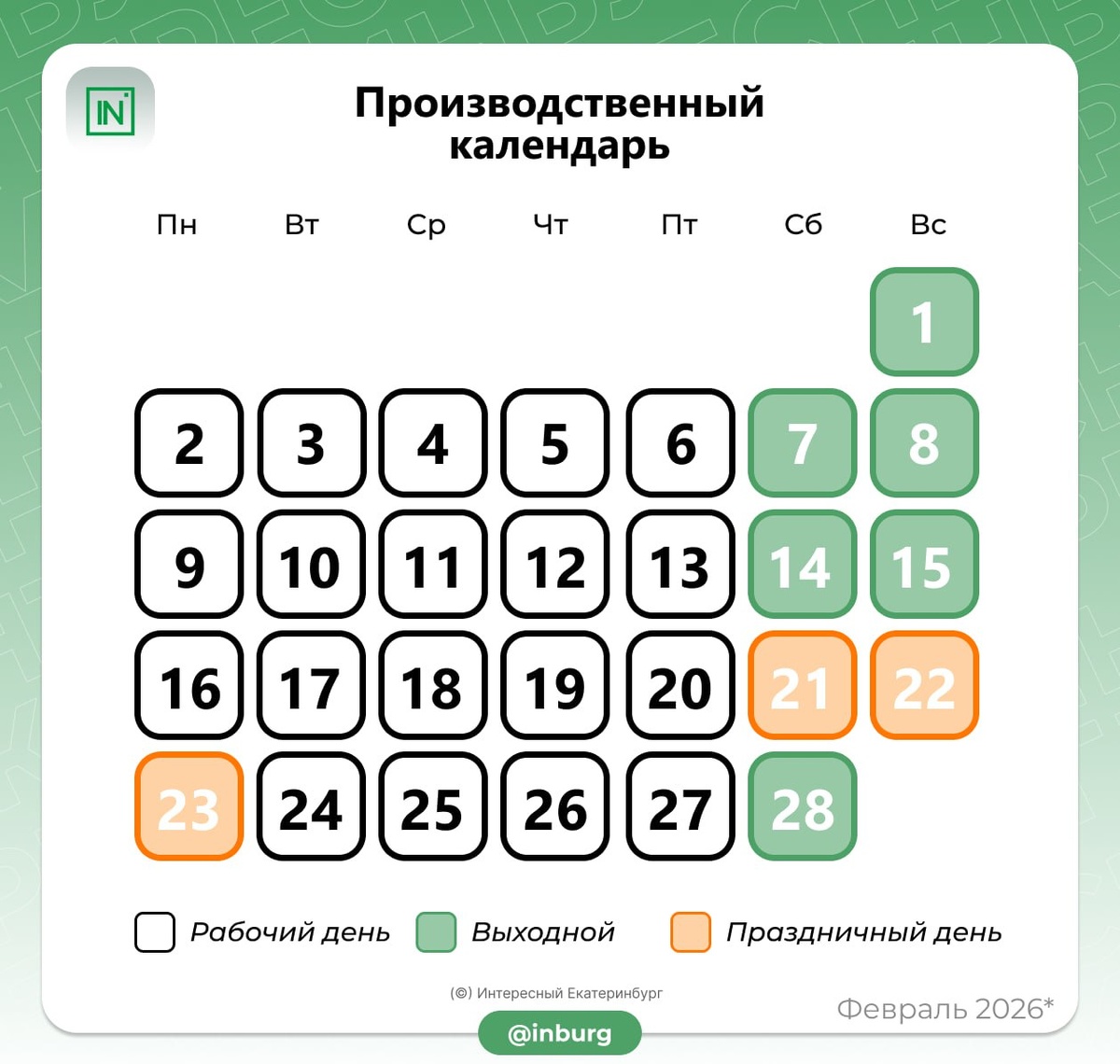 День защитника Отечества выпал на понедельник. Теперь работаем с 24 по 27 февраля, а там уже выходные.