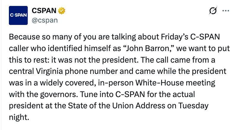 Телеканал C-SPAN в Х опроверг предположение о том, что таинственный звонивший "Джон Баррон" мог быть президентом США