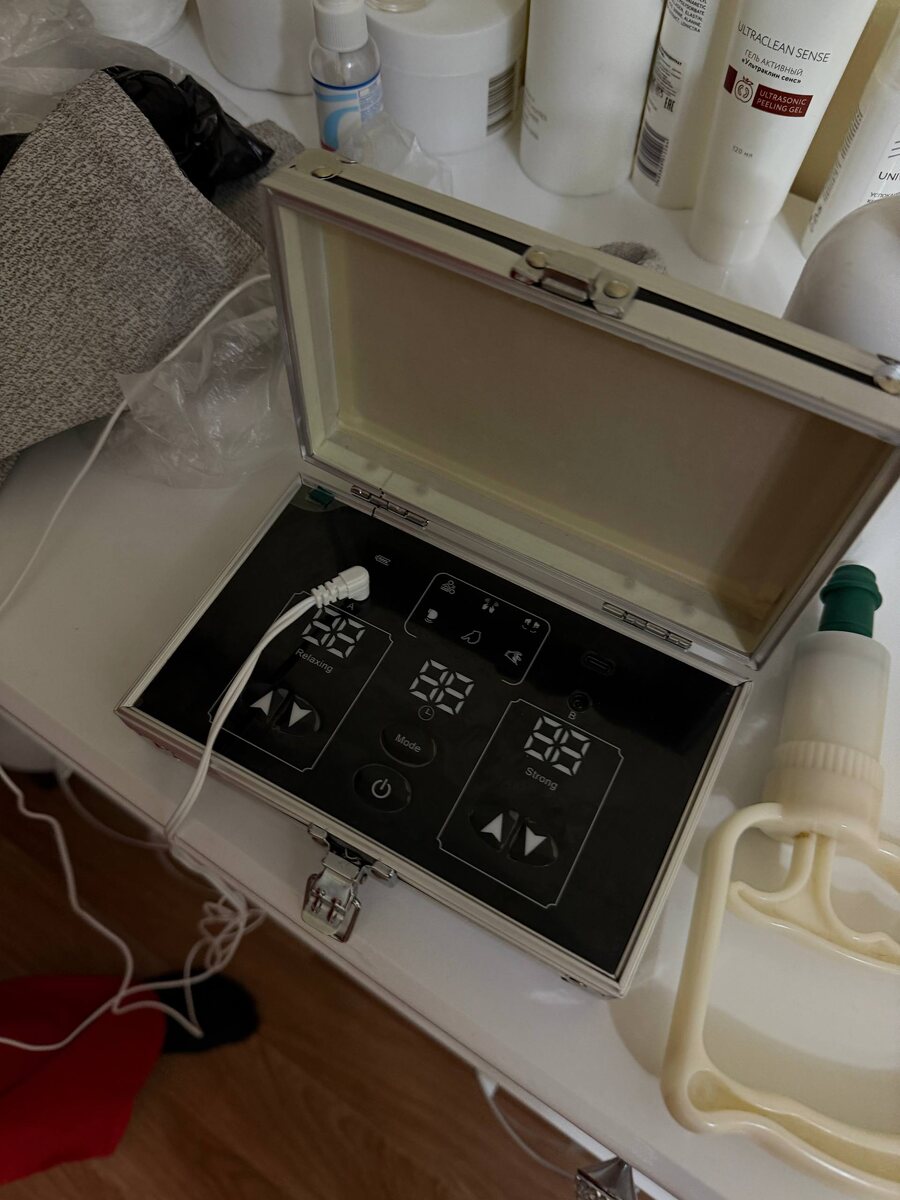 Вот вы знаете, что это за приблуда? Я тоже не знал, до вчерашнего дня, пока не приехал на массаж. И знаете что? Я ахуел. Снова. Это приблуда, к которой подключаются специальные перчатки, и от них херачит нормально так током. Я от них ломался как стрекоза на морозе. Но эффект — во 👍👍👍 Полез искать на WB себе такую же 🌚