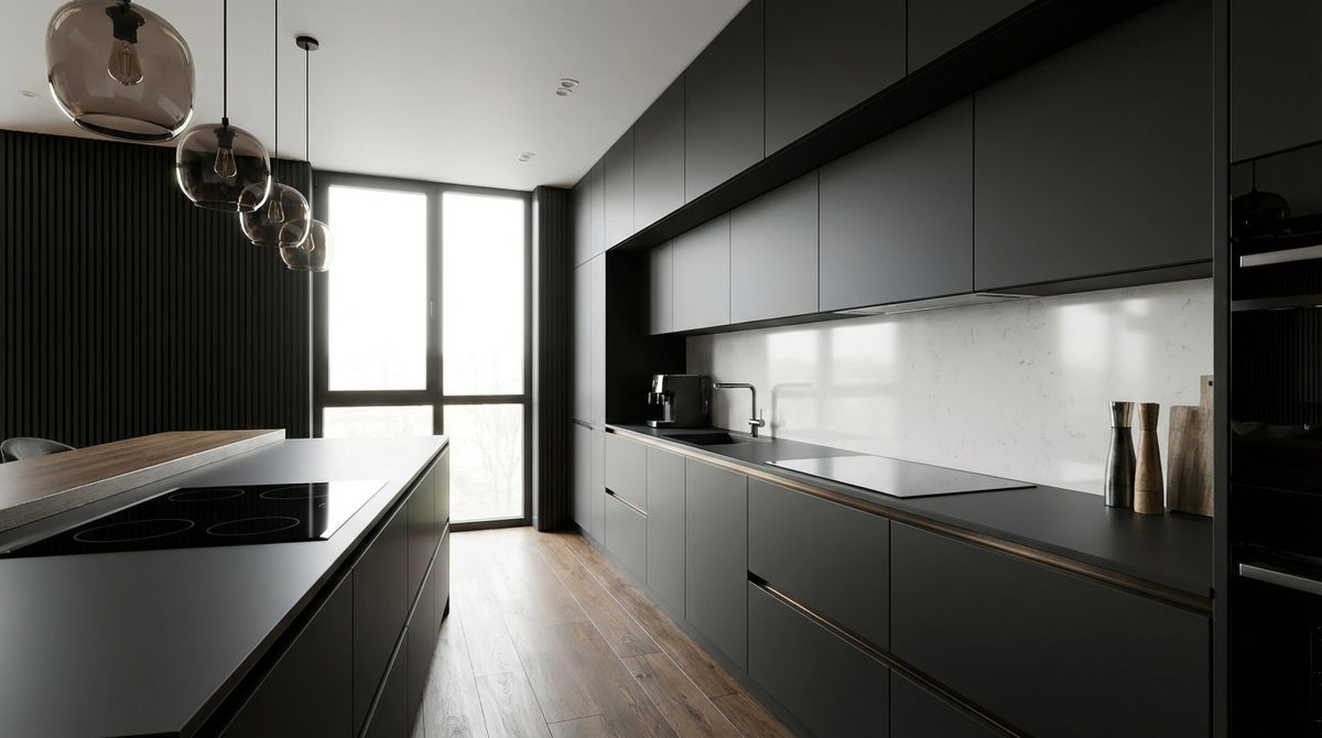 Минимализм исключает визуальный шум. Здесь мебель становится монолитным архитектурным элементом. Дверцы лишенные ручек (системы push-to-open, скрытые профили Gola), встроенная техника вровень фасадам, идеально ровные плоскости. Преобладают свинцовые, глубокие серые, иссиня-черные тона. Ключевая задача: создание единой непрерывной линии, растворяющейся пространством.