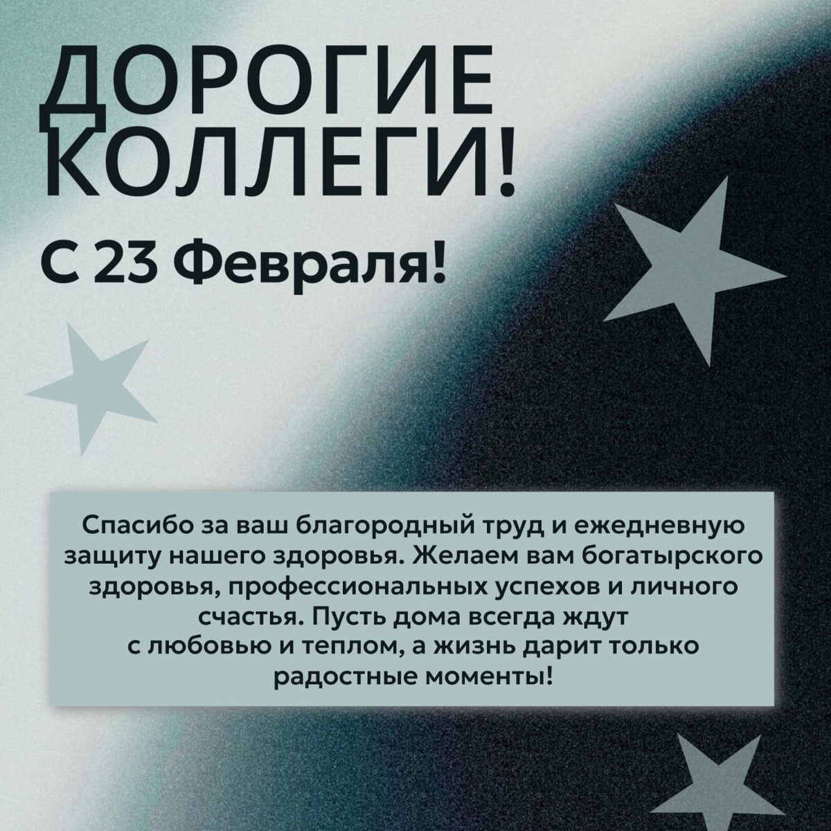! От всей души поздравляем вас с Днём защитника Отечества! Желаем вам крепкого здоровья, профессиональных достижений, душевного равновесия и благополучия в семьях. Пусть рядом всегда будут надёжные товарищи, а в сердцах — гордость за выбранное дело!