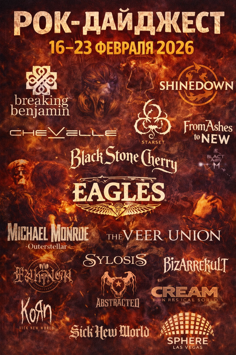 Неделя получилась плотной. С 17 по 20 февраля рынок живых концертов буквально взорвался: Breaking Benjamin и Shinedown одновременно выкатили масштабные туры, и 2026 уже выглядит годом тотального гастрольного давления. Breaking Benjamin стартуют 2 сентября в Camden, NJ и берут с собой Chevelle, Starset и Kami Kehoe. Пакет тяжёлый и рассчитан на большую аудиторию. Shinedown отвечают своим составом: Coheed and Cambria, Black Stone Cherry, From Ashes to New и DJ Rock Feed. По плотности сетов это один из самых амбициозных маршрутов года. Отдельная история — Eagles. Дон Хенли прямо сказал, что 2026, вероятно, станет для группы последним годом. После заявления добавлены ещё два концерта в Sphere в Лас-Вегасе — 10 и 11 апреля. Резиденция растянулась до 58 шоу. Формат 360°, масштабная постановка и ощущение финала эпохи. По релизам 20 февраля вышло более шестнадцати альбомов. Michael Monroe представил Outerstellar — глэм с живой энергетикой. Sylosis выпустили The New Flesh через Nuclear Blast.