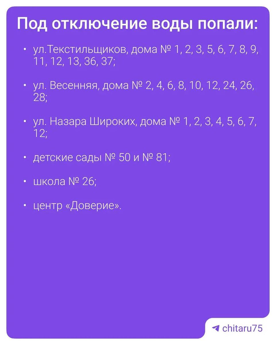 Под отключение воды попали дома на улицах Весенней, Назара Широких, Текстильщиков, а также несколько соцобъектов. Для жителей организовали подвоз воды.⬆️ В своём тг-канала мэр Читы Инна Щеглова написала, что ремонт будет идти ориентировочно до 18:00: Управляющие компании оповещены. Ситуация на контроле. 💬 Полторы недели назад в посёлке уже была такая авария, её устранили на следующий день. 🟦 «Чита.Ру» в MAX