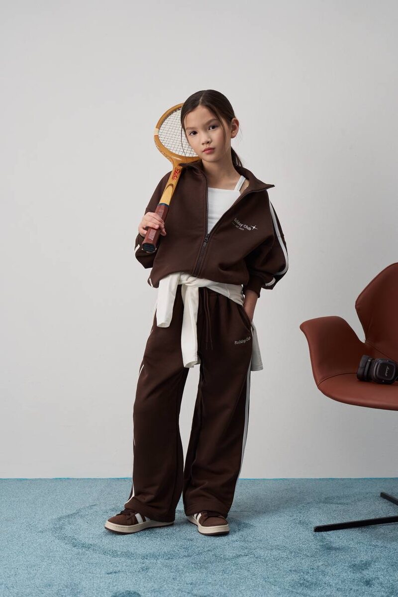 Глубокий шоколадный оттенок, контрастные лампасы и прямой силуэт создают образ в эстетике 90-х, который подходит и мальчикам, и девочкам