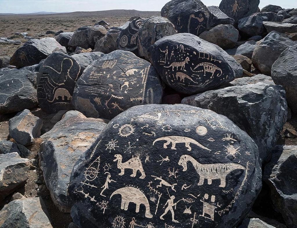 - Небо было их домом: технологии полета. На камнях — не стилизованные птицы, а сложные инженерные аппараты. Объекты с четкими фюзеляжами, стабилизаторами, кабинами пилотов. Некоторые напоминают современные истребители, другие — странные дирижабли или ракеты. Рядом — люди в疑似 скафандрах, управляющие приборами.