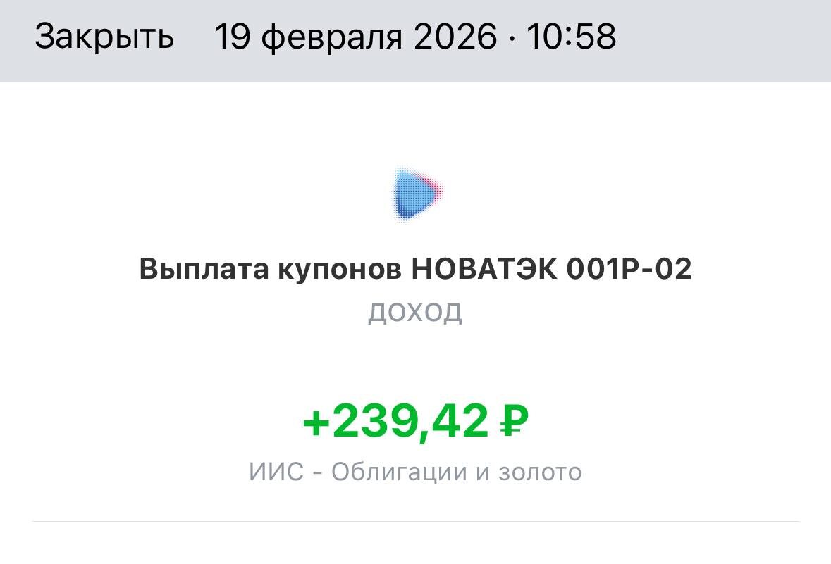 На той неделе прилетели по 💰 $RU000A10DTF1 - 29,58р 💰 $RU000A108G70 - 239,42р Всего 269,00 рублей ‼️ Мои 🔝 #облигации ‼️ ✅ Новатек 001Р-02 - $RU000A108G70 - купон 6,25% в $ ✅ Газпром Нефть 006Р-02R - $SIBN6P2 - купон 7,5% в ¥ ✅ Интерлизинг 7 - $RU000A1077X0 - купон 16% ✅ Яндекс Финтех выпуск 2 - $RU000A10C3F4 - купон 16,5% ✅ Брусника 002Р-04 - $RU000A10C8F3 - купон 21,5% 🎯 ежемесячные купоны 1000р 🎯 ежемесячные купоны 1500р ⏳ ежемесячные купоны 2000р #прояви_себя_в_пульсе