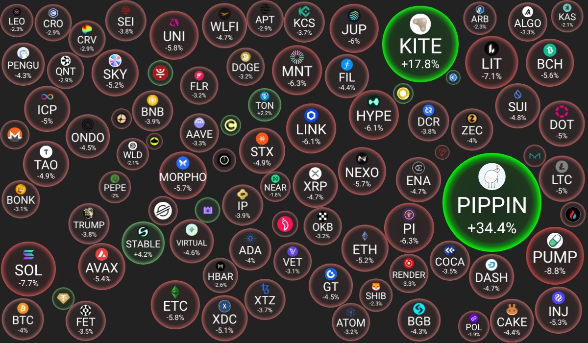 🗓 23.02.2026 09:30 по Москве. 🔗 Посмотреть на сайте 📈 Лидеры роста (из ТОП-100): 🟢 pippin (PIPPIN): $0.6684 (+34.4%) 🟢 Kite (KITE): $0.2610 (+17.8%) 🟢 Stable (STABLE): $0.0293 (+4.2%) 📉 Лидеры падения (из ТОП-100): 🔴 Pump.fun (PUMP): $0.0019 (-8.8%) 🔴 Solana (SOL): $78.59 (-7.7%) 🔴 Lighter (LIT): $1.3930 (-7.1%) 🔍 Основные метрики: 🔴 Общая капитализация: $2246.29 млрд (-3.68%) 🟢 Общий объем торгов: $75.47 млрд (+47.08%) 🔴 Доминация Bitcoin: 58.16% (-0.25%) 🔴 Доминация Ethereum: 10.07% (-0.17%) 🔴 Индекс страха и жадности: 5 / 100: ЭКСТРЕМАЛЬНЫЙ СТРАХ (-4) 🟢 Индекс Альтсезона: 32 / 100: НЕ АЛЬТКОИН-СЕЗОН (+1) 📖 Интересно почитать: 👉 Airdrop Checker. Проверка кошельков на бесплатные раздачи криптовалют. 😻 Наши сервисы и бонусы: 🫧 Coinbubbles.ru - наглядная визуализация рынка криптовалют в виде пузырей 📈 Gate - 20% скидка на комиссии при торговле на споте и фьючерсах