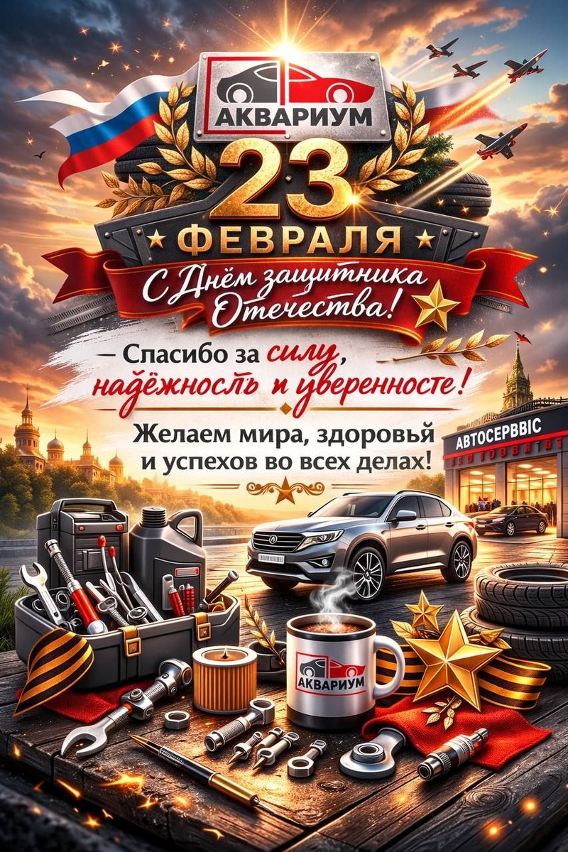 "! От всей души поздравляем вас с 23 февраля Днём защитника Отечества! Пусть этот праздник станет символом мужества, стойкости и надежности. Желаем вам крепкого здоровья, удачи на дорогах жизни и пусть ваш автомобиль служит верным помощником в любых ситуациях! Спасибо, что доверяете нам обслуживание своего автомобиля! С праздником, дорогие друзья! Команда автоцентра "Аквариум"! 1. Автоцентр АКВАРИУМ Московская обл., г. Серпухов, ул. Коншиных 108 +79165550545 www.aqauto.ru/ vk.com/aqauto https://dzen.ru/id/634d3d0f6e97eb3e5a87a0f0 t.me/aqauto_bot t.me/AquariumAuto yandex.ru/navi/org/a... #серпухов #автосервис #автосервиссерпухов #автоцентр #эвакуатор #эвакуацияавто #эвакуатор #заменамасладвс #компьютернаядиагностика #шиномонтаж #сходразвал #автотехцентр #развалсхождение #aqauto #aquarium #ремонтавто #ремонтавтосерпухов #заменамасла #ремонтдвигателя #заправкакондеционера #заменагрм #мойкаавто #полировка #полировкаавто #химчисткаавто #полировкафар