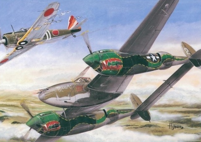 На заглавной картинке исполнения Густава Хюбнера (Gustav Hybner), красочный Lockheed P-38L «Lightning» из 459-ой эскадрильи USAAF (459th FS) и не менее красочное подтверждение идеи фикс ГлавРеда про черно-белую Историю Авиации, в которой каждый, в зависимости от своих собственных желаний и предпочтений, найдёт именно то, что хочет найти. С одной, «чёрной» стороны, факт периодических и основательных завышений своих успехов пилотами, с другой, «белой», непропорционально большой, относительно численности, вклад тех же самых пилотов в «обнуление» японской авиации в Бирме. *** Красиво разваливающийся на заднем плане Ki-43-I комполка 11-го Сентая, Катсуджи Сугиуры – явное преувеличение. Когда на фронте появились «Лайтнинги», этой японской авиачасти в Бирме уж полтора года как не было.
