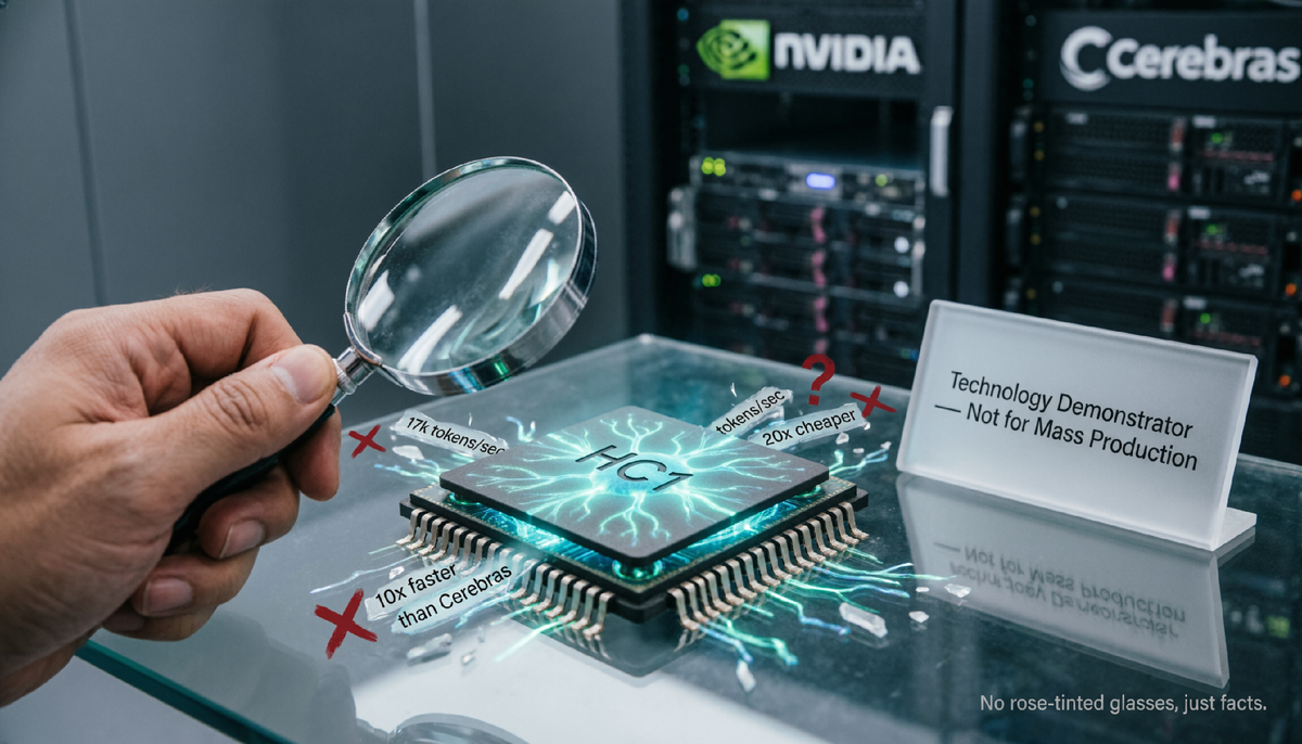 Цифры впечатляют: «17 000 токенов/сек, в 10 раз быстрее Cerebras, в 20 раз дешевле». Звучит как приговор конкурентам. Но немецкое издание Heise, которое разбирается в железе не понаслышке, прямо указывает: эти данные — результаты внутренних тестов Taalas. Независимого аудита ещё не было.
