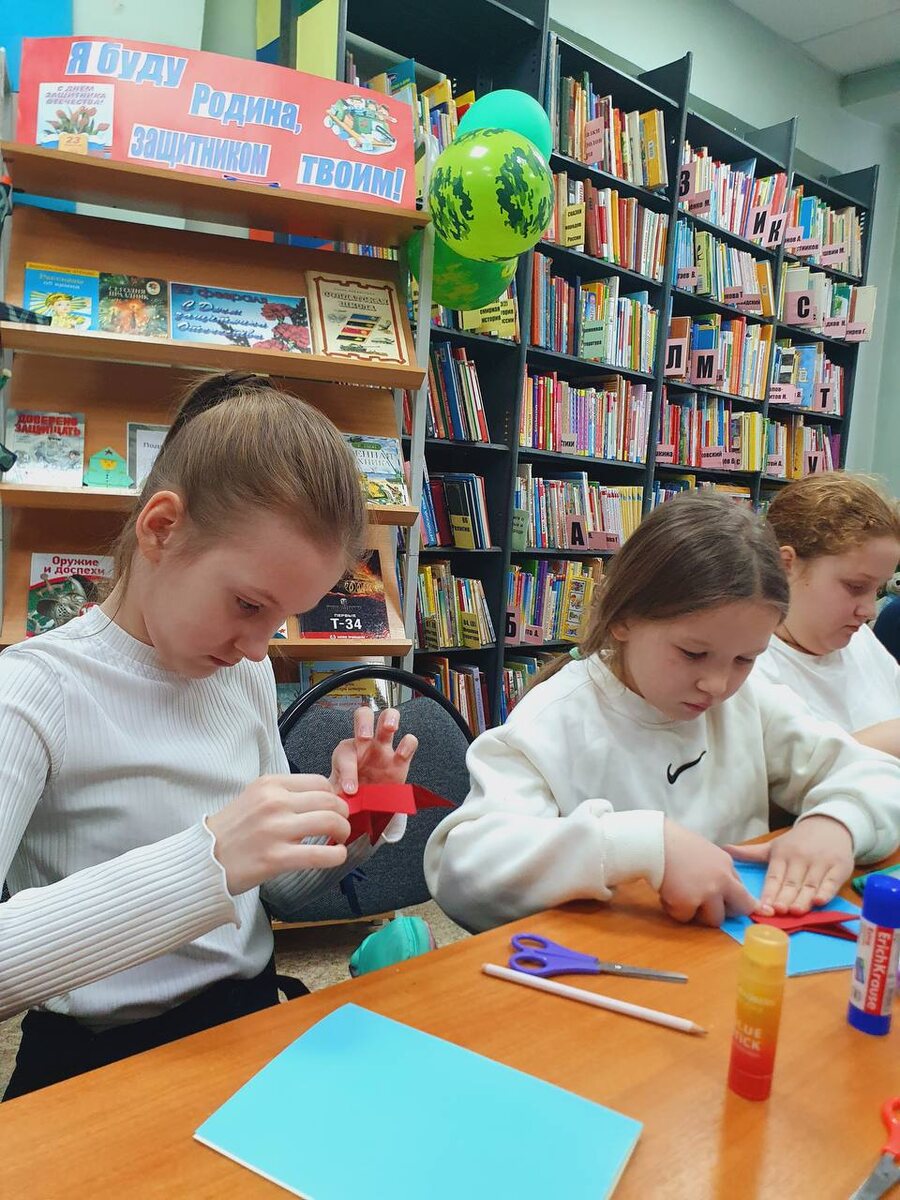 ✨ Накануне Дня защитника Отечества 🎉 в городской библиотеке №2 прошёл творческий мастер-класс по созданию поздравительных открыток для пап ☺️. Ребята с удовольствием занимались аппликацией из цветной бумаги 🎨, создавая яркие и красивые поделки под руководством библиотекарей 📚. Получившиеся подарки вышли оригинальными и душевными, наполненными теплыми словами и заботой 💐. Завершилось мероприятие рассказами детей о качествах своих любимых пап-защитников 👪. Все участники остались довольны своей работой и получили заряд отличного настроения ✨. 👉 Прислать новость 💥 Проект "Чехов Детям"