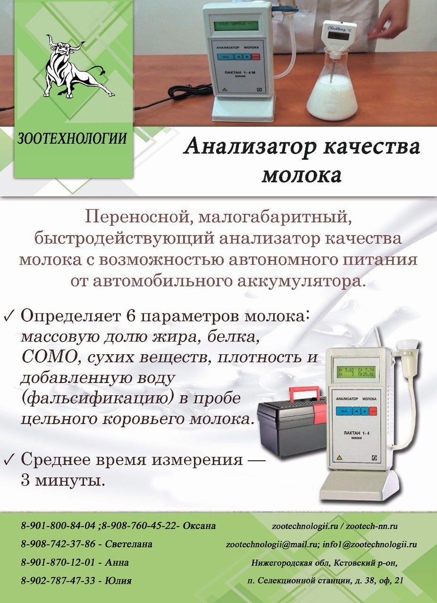 Добрый день. 📊 В продаже анализатор качества молока «Лактан» исполнение МИНИ, который предназначен для автоматического измерения массовой доли жира, белка, сухого вещества в цельном свежем, консервированном, пастеризованном, стерилизованном, восстановленном, обезжиренном молоке, молоке длительного хранения и сливках. 👍 Дополнительная сервисная функция — индикация показаний: сухого обезжиренного молочного остатка (СОМО), плотности, добавленной воды. ✔️ Анализатор может использоваться для проведения экспресс-анализов при заготовке, приёмке и переработке молока, а также в селекционной работе. ⚠️ Важно: анализатор поставляется с заводской градуировкой только на цельное коровье молоко. При необходимости работы с другими видами молока (пастеризованное, стерилизованное, обрат, сливки и т. д.) следует выбрать другую модель анализатора. Оставить заявку можно у наших менеджеров: Оксана: 8-901-800-84-04; 8-908-760-45-22 Светлана : 8-908