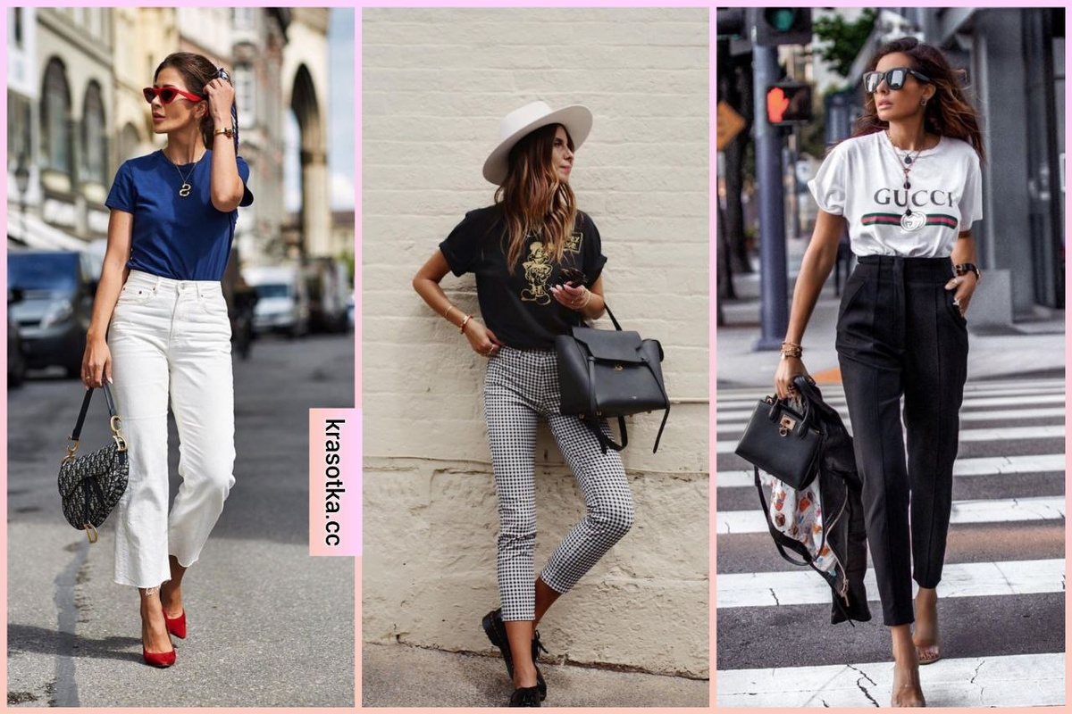 Иногда хочется создать повседневный образ, который будет выглядеть женственно и элегантно. В этом случае идеальным выбором станут брюки с футболкой. Такой дуэт подходит как для ежедневного выхода, так и для вечерних мероприятий или деловых встреч. Сегодня мы расскажем, как правильно сочетать эти элементы гардероба, чтобы выглядеть стильно и современно.но. В качестве верхней одежды подойдет жакет, блейзер, пиджак или летний бомбер. Не стоит забывать и про аксессуары. В моде на данный момент небольшие модели сумочек и клатчей, а также поясные варианты. Именно их мы советуем использовать в паре с брюками и футболкой. Также присмотритесь к стильным головным уборам - широкополым шляпам, котелкам и федорам. Читайте также: Как и с чем носить юбку-брюки: 15 ярких и оригинальных примеров на [year] год Практичная и удобная модель брюк джоггеры отлично смотрится совместно с футболкой. Брюки относят к повседневной и спортивной стилистике, что дает возможность собирать лук для любого мероприятия. Е
