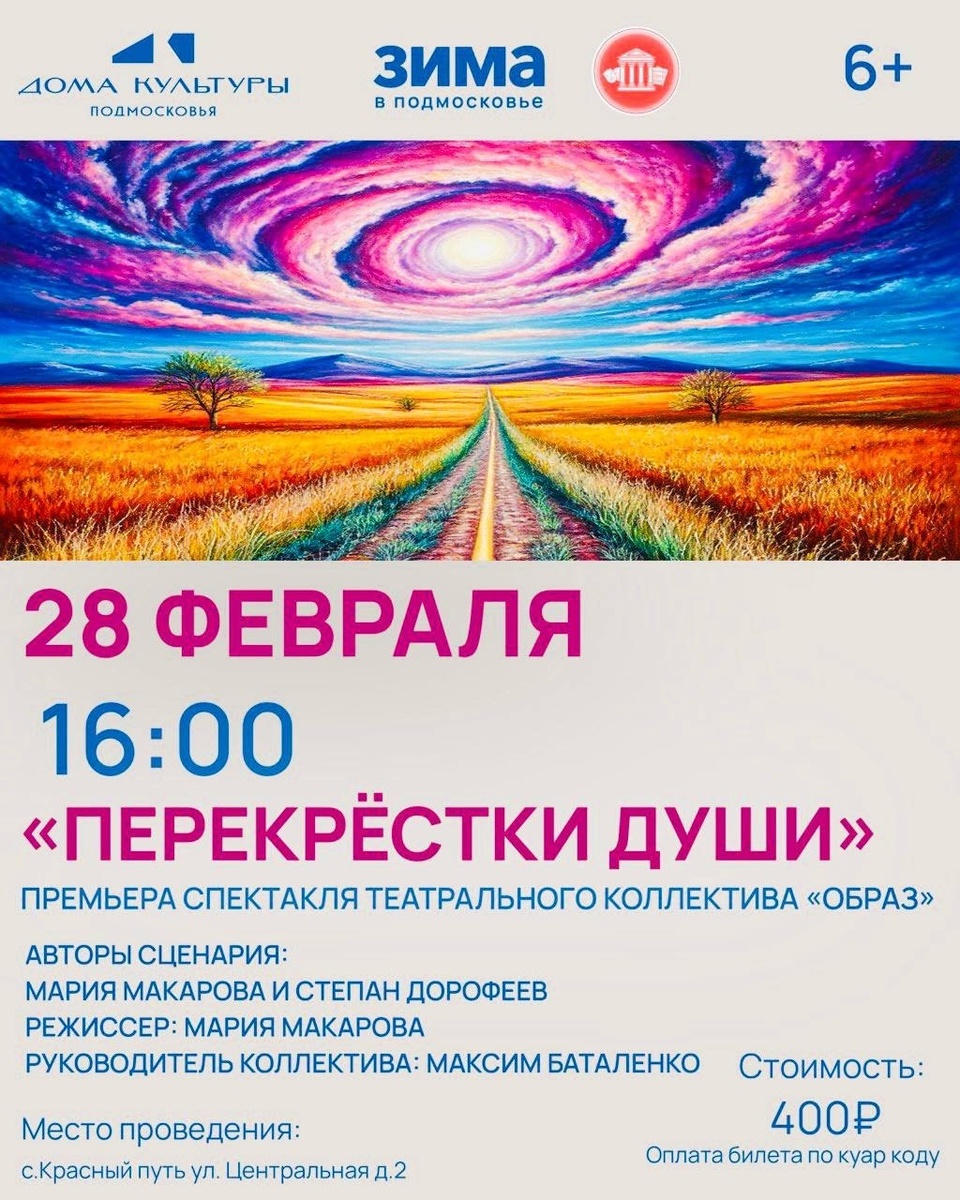 ✨ СДК «РУСЬ» приглашает «Перекрёстки души» - премьерный показ спектакля театрального коллектива «Образ» 🎭🎭🎭🎭🎭🎭🎭🎭🎭🎭 Примечательно то, что авторами сценария стали участники коллектива: Степан Дорофеев и Мария Макарова. Она же выступила в роли режиссера этой постановки, под чутким руководством руководителя - Максима Баталенко. 🎭🎭🎭🎭🎭🎭🎭🎭🎭🎭 🚫 Возраст: 6+ 📆 28.02.2026🕒16:00 🏢 Сельский дом культуры (СДК) «Русь» 📍 г.о.Домодедово, с.Красный Путь, ул.Центральная, д.2 💰 Цена: 400 ₽ ✅ Мероприятия Домодедово https://dzen.ru/id/66f10385cc4c5a16f7b5fb02 http://vk.com/domodedovo_events http://dzen.ru/domodedovo_events