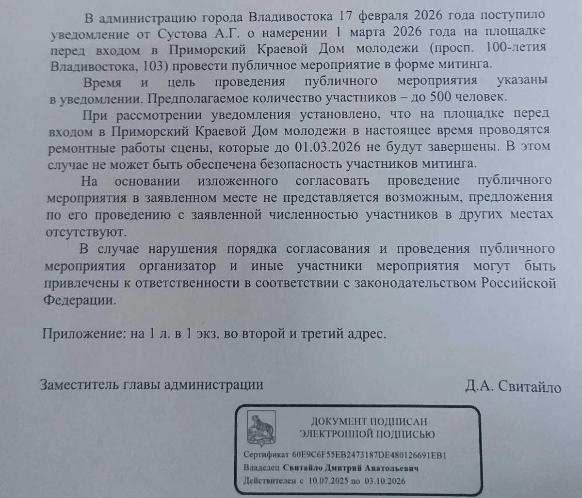 Депутат Законодательного Собрания Приморского края Александр Сустов и депутат думы Надеждинского района Олег Григорьев получили отказ в проведении митинга против экономической политики властей и ограничений в работе мессенджеров. Об этом корреспонденту @vladivostok1 рассказал Олег Григорьев. В ответном документе указано, что проведение мероприятия 1 марта невозможно из-за ремонтных работ сцены, на которые администрация ссылалась еще в ноябре 2025 года, когда отказывала в организации митинга против утильсбора. «Начиная с третьей декады ноября 2025 года до весеннего периода 2026 года на площадке перед входом в Приморский краевой центр молодежи будут проводиться ремонтные работы, в том числе в отношении сцены и прилегающей территории», — говорилось в ответе. Олег Григорьев назвал очередной отказ необоснованным и заявил, что никакого ремонта площади на самом деле нет, но сделать с этим депутаты ничего не могут. «Это уже какой-то бред, сюрреализм. Ремонта никакого нет, но отказывают на
