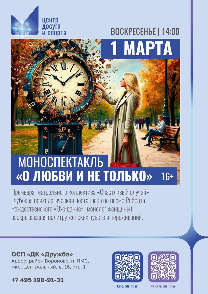 И замерло время ✨ За эти мгновения — целая жизнь: от трепетной надежды, дрожащей, как огонёк на ветру, до мучительного вопроса, который жжёт изнутри: «Придёт ли он?». Каждая секунда — испытание. Каждая пауза — бездна, в которую проваливается сердце. Приглашаем вас на моноспектакль «О любви и не только...» в исполнении театрального коллектива «Счастливый случай». Это глубокая психологическая постановка по знаменитой поэме Роберта Рождественского «Ожидание (монолог женщины)», раскрывающая всю палитру чувств человеческой души 🥀 На сцене — час ожидания без масок, без защиты, с обнажённой душой. Вы услышите невысказанные слова, почувствуете дрожь в голосе и тишину, которая кричит громче любого крика. Это не просто монолог — это откровение и исповедь женщины, которая ждёт, верит и надеется. 🎭 В главной роли Наталья Гостомыслова 🎬 Руководитель коллектива Карганова Галина Евгеньевна 📍 Вход свободный. Ждём вас! #анонсывороново #анонсытинао #новоститинао