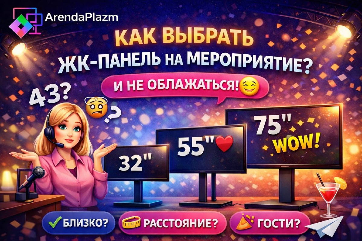 😉 Часто слышим от клиентов: «Нам бы экран… ну, нормальный» 😄 А дальше начинаются вопросы: 43? 55? 75? 86?🤯 Давайте разберёмся просто. ⸻ 🔹 43” — для небольших задач Подойдёт для: ✔️ регистрации ✔️ расписания ✔️ welcome-зоны ✔️ маленьких помещений Если гостей много — не лучший вариант. ⸻ 🔹 55-65” — самые универсальные ❤️ Наши хиты. Подходит для: ✔️промо на стенде ✔️ презентаций в небольшом помещении ✔️ демо-продуктов ✔️ конференций 👉 Если сомневаетесь — берите 55-65”. В 80% случаев — попадёте. ⸻ 🔹 75-86” — эффект «ВАУ» 🔥 Подходит для: ✔️ больших залов ✔️ сцены ✔️ презентаций ✔️ выступлений ✔️ конференций ——— 🔹 100” — максимум эффекта 🔥 Для тех, кому нужно по-настоящему впечатлить. Подходит для: ✔️ больших залов ✔️ масштабных презентаций ✔️ форумов и конференций ✔️ премиальных мероприятий ✔️ запусков продуктов ✔️ важных переговоров ✔️ мероприятий с VIP-гостями ⸻ 📏 Простое правило Чем дальше зрители — тем больше экран. Близко → 32–43” Средне → 55-65” Далек