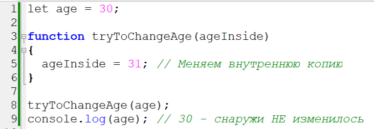 Представьте, что вы дали другу свою книгу, он в ней что-то подчеркнул карандашом, и вернул вам обратно. Когда вы снова открываете книгу, пометки на месте — они остались. Всё логично. Но иногда в JavaScript происходит путаница: вы передаете объект в функцию, меняете его внутри, а снаружи он... не меняется. Или меняется, но не так, как вы ожидали. Давайте разберемся, почему так происходит, на понятных примерах. Обычно с простыми вещами (цифрами, текстом) всё просто. Копируя значение, мы создаем его независимую копию: Здесь внутри функции появилась своя независимая переменная ageInside. Мы изменили её, но на исходную переменную age это никак не повлияло. Это как отксерокопировать документ и исправить копию — оригинал останется прежним. Когда мы работаем с объектами, в переменной хранится не сам объект, а как бы "адрес" его места в памяти компьютера. Это как номер дома, а не сам дом. let person = { name: "Анна" }; Переменная person хранит не Анну целиком, а координаты, где искать информаци