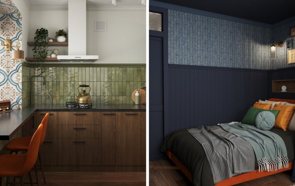 Акцентами служат фактуры натурального дерева, а также приглушенные горчичные и терракотовые оттенки. Они добавляют глубины и ощущения «прожитости», будто пространство формировалось не за один год, а постепенно наполнялось вещами, воспоминаниями и светом.