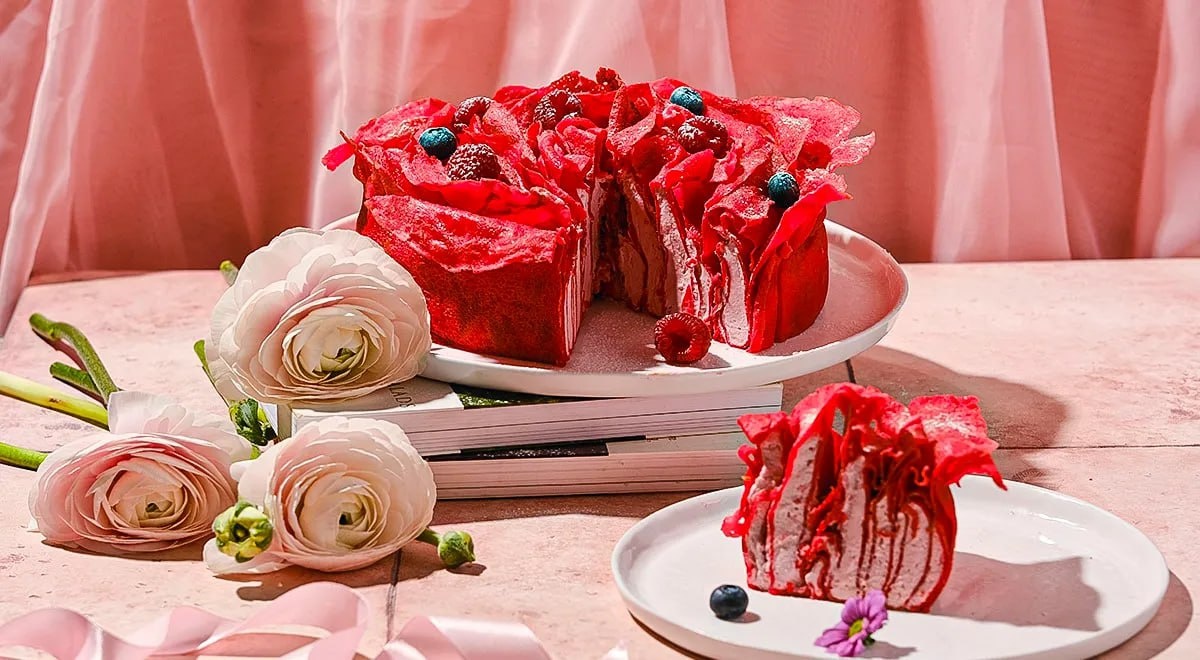 » 📖 Ингредиенты: Для блинов: * Молоко — 500 мл * Яйца — 3 шт. * Мука — 250 г * Сахар — 2 ст.л. * Соль — щепотка * Масло сливочное (растопленное) — 50 г * Масло растительное — 2 ст.л. * Краситель пищевой красный — по желанию Для малинового пюре: * Малина (можно замороженная) — 150 г Для крема: * Сливочный сыр — 500 г * Сливки 33% — 150 мл * Сахарная пудра — 100 г 🧑🏻🍳 Приготовление: 1. Малину с 2 ст.л. воды довести до кипения, проварить 2 минуты и протереть через сито. Остудить. 2. Смешать яйца, сахар и соль. Влить молоко, перемешать. Постепенно добавить муку, взбивая венчиком. Влить оба вида масла и половину малинового пюре. Дать тесту постоять 15–20 минут. 3. Испечь тонкие блины на разогретой сковороде с двух сторон. Полностью остудить. 4. Для крема: холодные сливки взбить с сахарной пудрой до устойчивых пиков. Добавить сливочный сыр и оставшееся малиновое пюре, аккуратно перемешать. 5. Каждый блин смазать 2–3 ст. ложками крема, оставляя края свободны