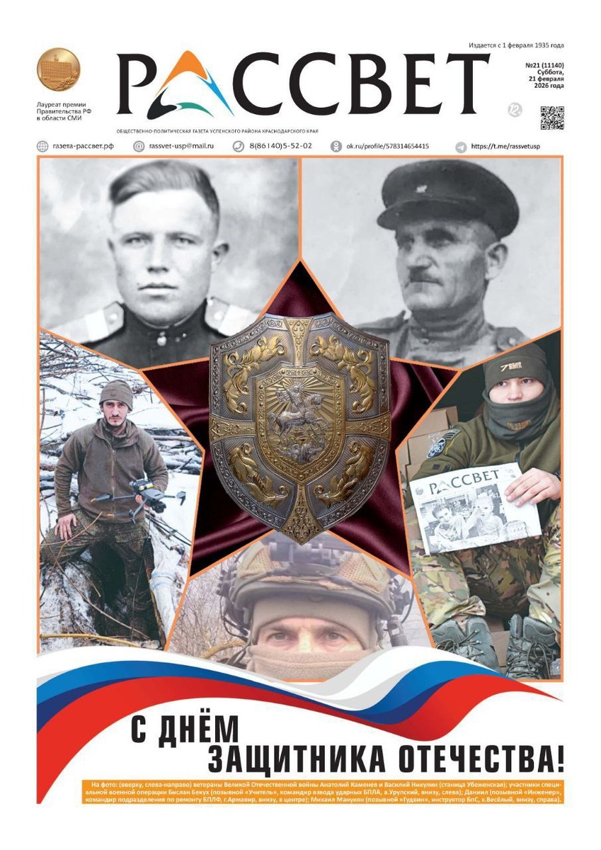 целом - уникальным. Вверху - два ветерана Великой Отечественной -Анатолий Каменев и Василий Никулин. Их имён, по словам Т.А. Панариной из Убеженской, даже в "Книге памяти" района не было. А история там потрясающая, параллели с той войной и нынешней. После оккупации в 1943 году казачки вязали нашим солдатам носки, рукавицы теплые и отправляли на фронт - как и сейчас, тогда тоже помогали всем миром. И в 1945 в станицу прибыл один из тех, кто получил посылку. Оба ветерана - один наш убеженский казак, а второй зятем стал, приехав посмотреть, кто вязал носки - и влюбился, остался! Еще фото Бислана Бекуха - адыга, Михаил Манукяна - армянина, Даниила ("Инженер", здесь на фото с отцом) русского - операторы летающих и наземных БПЛА, а Даня - ремонтирует эту технику. Святой Георгий и наши защитники всех времён - оплот государства! Читайте о них - в следующем номере "Рассвета"!