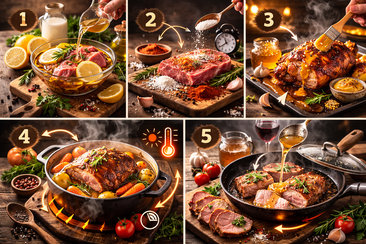 Сочное мясо — мечта любого гурмана. Даже простая котлета или запеченная свинина могут получиться сухими, если не знать некоторых хитростей. Мы собрали 5 неожиданных способов, которые помогут сделать любое мясо мягким, ароматным и сочным. Добавление кислоты в маринад — простой способ смягчить мясо: Совет: замаринуйте мясо на 1–3 часа. Кислота размягчает белковые волокна, делая мясо нежным и сочным. Немного соли и сахара за 30–60 минут до жарки делают чудеса: Идея: попробуйте смесь соли, паприки и немного сахара для яркого аромата. Нанесите тонкий слой меда, горчицы или их смеси на мясо перед запеканием или жаркой. Совет: наносите глазурь в конце приготовления или за 20–30 минут до готовности. Мясо, особенно грубых частей (например, рулька, лопатка), становится сочным при медленном приготовлении на низкой температуре. Эффект: белки развариваются, коллаген превращается в желе, мясо тает во рту. Даже обычное жаркое или стейк можно сделать сочнее, если добавлять немного жидкости: Совет: исп
