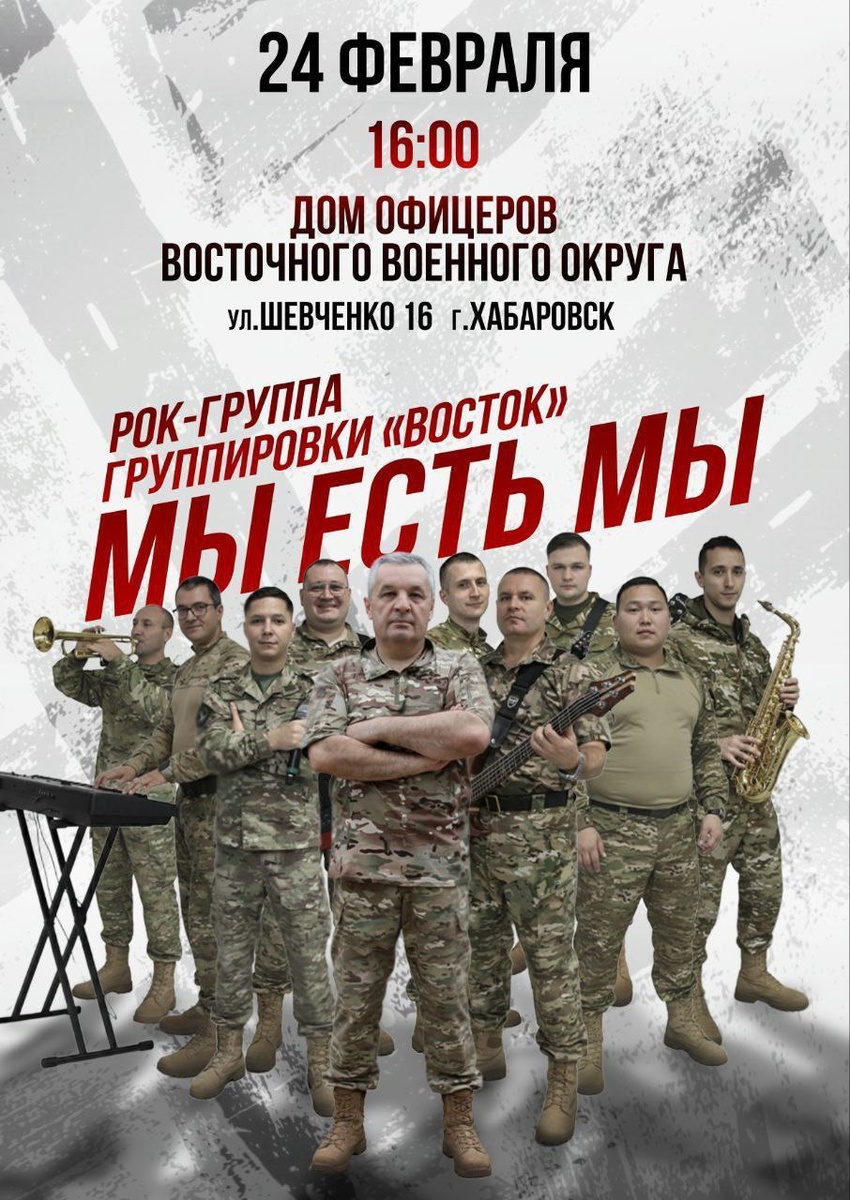 » ✔ Патриотический концерт рок-группы группировки «Восток» ✔ На сцене Окружного дома офицеров ✔ В программе — рок-композиции о единстве и силе духа ✔ Музыкальное событие для широкой аудитории 📅 Когда: #24_февраля в 16:00 ⛳ Где: ОДОРА 💳 Вход по пригласительным билетам(в кассе ОДОРА) 👉 Афиша Хабаровска. Куда сходить, экскурсии