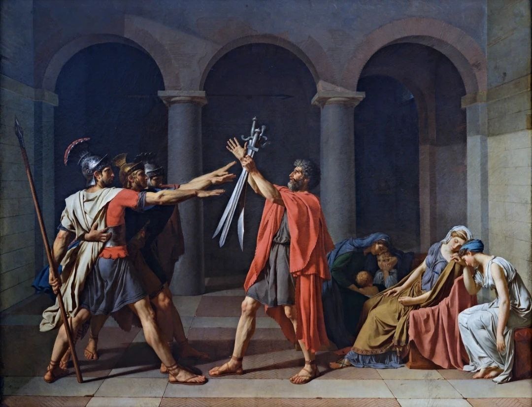 ⭐ Хоть Вас не так много на этом канале, но очень лестно, что продолжаете здесь оставаться и интересоваться искусством 🙏 Естественно на этой неделе в честь Вас, не могу обойти стороной картины с самыми брутальными и мужественными сюжетами 😎 И начнем мы с картины "Клятва Горациев" Жака Луи Давида. Вообще говоря о мужественности, самыми яркими всегда будут полотна классицизма и неоклассицизма - ведь насточщий мужчина стабилен в своих предпочтениях, а работы в классическом стиле писали на протяжении более трёх столетий. На полотне мы видим сцену из римской легенды. В ней рассказывается о споре между двумя городами: Римом и Альба Лонгом. На картине Жак Луи Давид показывает, как три брата поднимают руки в римском приветствии и клянутся победить или умереть. Герои понимают, что отправляются на смертельный бой, но они полны решительности. В их лицах нет сомнений, они едины в порыве защитить город и верят в победу. Работа симметрична и уравновешена геометрическими формами. На ней преобл