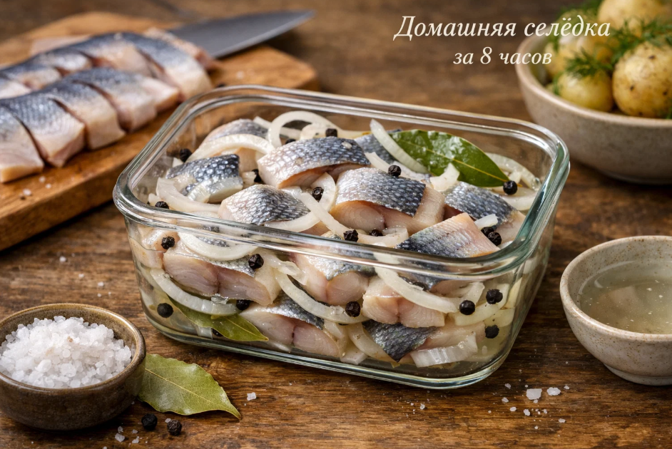 А вот экспресс-засолка за восемь часов оказалась оптимальным вариантом для меня. Утром достал рыбу из морозилки, днем засолил, а вечером уже можно подавать на стол. Идеально для ситуации, когда неожиданно нагрянули гости или просто захотелось свежей селедочки к ужину. Рыба получается нежной, в меру соленой, и самое главное — не нужно долго ждать.