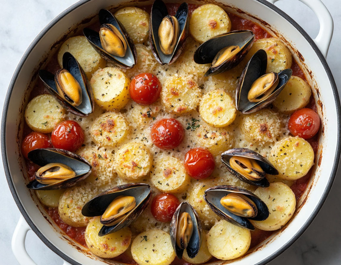 Тиелла по-барийски (Tiella di Riso, Patate e Cozze) — это легендарное блюдо из Апулии, которое называют «итальянской паэльей». Своё название оно получило от традиционной глубокой сковороды «тиелла», в которой рис, картофель и свежие мидии укладываются слоями и запекаются до образования фантастической золотистой корочки. Это блюдо — настоящий вкус Адриатики: соленое море, ароматный чеснок и сладость спелых томатов. Тиелла остается символом домашнего уюта и гостеприимства южной Италии. Для этого рецепта крайне важно использовать рис сорта Карнароли или Арборио — они впитают в себя все соки и не превратятся в кашу. Пошаговый рецепт Время приготовления: 1 час 20 минут Шаг 1: Подготовка мидий Мидии тщательно очистите. Секрет шефа: откройте мидии ножом, оставив мясо на одной створке, а вторую удалив. Сохраните морскую воду, которая выльется из ракушек — её нужно процедить и добавить в форму при запекании для насыщенного вкуса. Шаг 2: Нарезка овощей Картофель очистите и нарежьте тонкими кружо