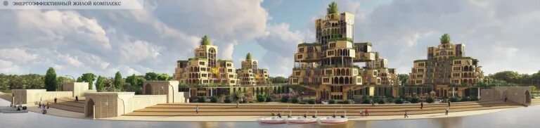 Форма зданий подчёркивает связь урбанизированных и природных объектов. Насыщенность «зелёных» решений позволяет комплексу стать частью природной экосистемы. Подобный подход к интеграции архитектуры и природной структуры городской среды ранее рассматривался в материале Алексея Саянова «Орбита Сириуса»: проектирование водно-зелёной инфраструктуры.