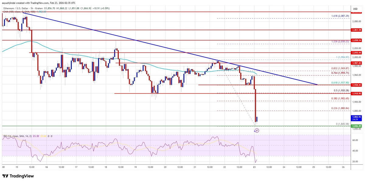 📉 Цена Ethereum резко снизилась, опустившись ниже $1,900 после провала удержания уровня $1,950. Это снижение указывает на усиление медвежьего тренда, с ключевыми уровнями сопротивления на отметках $1,920 и $1,950. MACD и RSI также подтверждают усиление нисходящего движения, что может привести к дальнейшему падению, если не будет удержан уровень $1,850. 📊 Ключевые моменты: - Текущая цена ETH торгуется ниже $1,900 и 100-часовой простой скользящей средней. - Медвежья линия тренда формируется с сопротивлением на уровне $1,950 на часовом графике ETH/USD. - Если ETH не сможет преодолеть сопротивление $1,920, возможно дальнейшее снижение до $1,850, $1,825 и далее до $1,780. - Ключевые уровни сопротивления находятся на $1,880, $1,920 и $1,950. Прорыв выше $1,950 может привести к росту до $2,000.