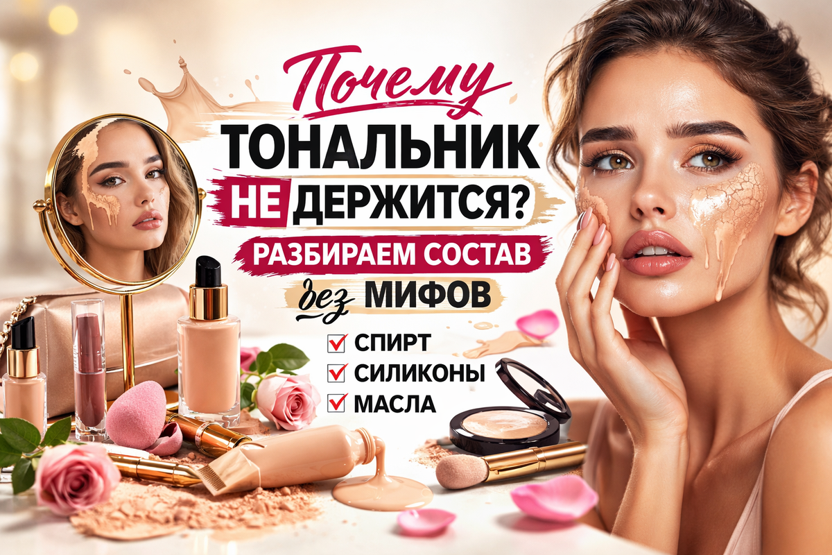 Утром вы аккуратно наносите тон, всё ровно, свежо, «как в рекламе». Проходит пару часов — и макияж живёт своей жизнью: на носу проплешины, на подбородке пятна, лоб блестит так, будто вы жарили на нём яичницу. В голове один вывод: «со мной что-то не так, кожа ужасная». Но чаще всего проблема не в вас, а в том, что написано мелким шрифтом на упаковке. Ссылка на бота - ТУТ! 1. Сушащие спирты и агрессивные добавки Чтобы тональный крем быстро схватывался и давал «матовый эффект», производители добавляют спирты и похожие компоненты. Сначала кожа вроде бы гладкая, матовая, а потом пересушенная поверхность начинает защищаться — жир вырабатывается активнее, тон «плывёт», подчёркивая все неровности.