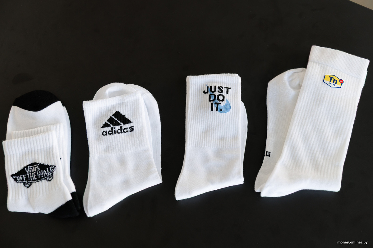 Пару им на время эксперимента составят мужские фейковые Adidas, купленные в одном из минских магазинов за 2 рубля. Этикетка говорит, что они сделаны в Турции, а в составе у них 80% хлопка, 15% спандекса и 5% эластана.
