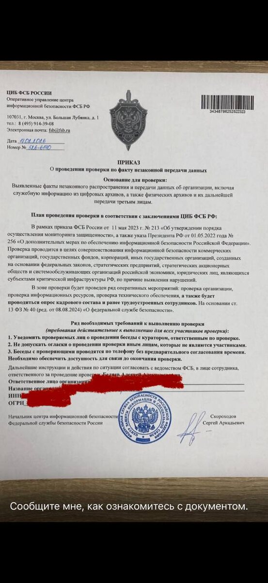 Наш генеральный директор сообщил об этом нашим партнерам и контрагентам, и даже в подтверждение прислал вот эту бумажку. Почему-то писал он не со своего аккаунта… Ладно, вы уже догадались. Это жулики-хохлы. Случаи мошенничества в России регистрируют теперь тысячами (мало на Украине выключаем свет, надо больше), и поэтому будет не лишним предупредить дорогих читателей, как не попасться на удочку. Во-первых, включайте голову и включайте логику. Я конечно в ФСБ не работаю, но мне вот кажутся формулировки из данного документа весьма сомнительными. Написано «Приказ», это кто кому приказывает? Мы же в ФСБ не работаем, как ФСБ нам что-то приказывает? И ещё и назначает внизу документа ответственных из нашей компании? Получается, мы тоже работаем в ФСБ? Тогда где мои ксива и ствол? «О проведении проверки по факту незаконной передачи данных» — это что за чушь? Нет такой формулировки, «незаконная передача данных». Это даже звучит тупо. «в целях совершенствования информационной безопасности»