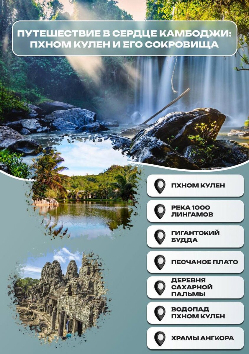Пхном Кулен. Тур №7 🌄 Путешествие в сердце Камбоджи: Пхном Кулен и его сокровища Однодневная поездка из Сием Рипа для тех, кто хочет увидеть Камбоджу не только в храмах, но и в природе 🕘Продолжительность — 8 часов Вы посетите: 🌿 Национальный парк Пхном Кулен - живописный природный заповедник, где можно насладиться красотой кхмерской природы. 🏞 Река 1000 Лингамов - уникальное место, где дно реки покрыто тысячами вырезанных в камне лингамов и йони, символизирующих плодородие и процветание. 🗿 Огромный лежащий Будда - величественная статуя Будды в состоянии нирваны, высеченная в огромном валуне на вершине горы, откуда открываются потрясающие виды. 🏜 Песчаное плато - захватывающий дух пейзаж с красными песчаными скалами, покрытыми зеленью, открывающий великолепные виды на окрестности. 🌴 Деревня сахарной пальмы - знакомство с жизнью местных жителей и возможность увидеть, как производится традиционный сахар из сока сахарной пальмы. 💦 Водопад Пхном Кулен - освежающий водопад,