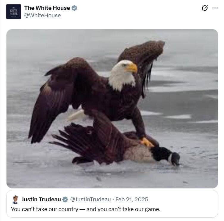 Но самой изящной частью этой публикации стал текст. Аккаунт Белого дома процитировал твит Джастина Трюдо от 21 февраля 2025 года — тот самый, победный: "Вы не можете отнять нашу страну — и вы не можете отнять нашу игру". И рядом — картинка с орлом и гусем. Никаких дополнительных комментариев не требовалось.