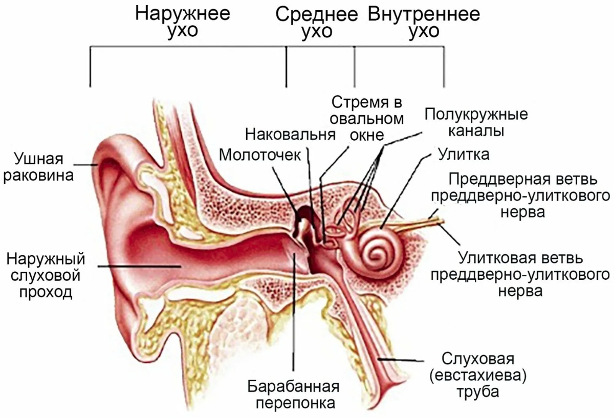 Строение человеческого уха очень сложное. Во много раз сложнее строения человеческого глаза. Особенно сложное строение среднего уха, и запредельно сложное строение внутреннего уха. До сих пор многое остается неясным в механизме одновременного преобразования и передачи огромного числа звуковых колебаний в широком диапазоне звуковых частот. Как мы слышим (кратко, обобщенно). 1. Ушная раковина, как воронка, ловит звуковую волну. 2. Звуковая волна, пройдя через наружный слуховой проход, усиливается в два раза. 3. Барабанная перепонка от звука вибрирует и приводит в движение молоточек. 4. Молоточек ударяется о наковальню. 5. Наковальня передает колебания стремечку. 6. Стремечко передает колебания улитке. 7. Внутри улитки имеются специальные нервы, которые воспринимают звуковые колебания в широком диапазоне (20-20000Гц) и преобразуют их в нервные импульсы. 8. Эти нервные импульсы через сложный слуховой нерв передаются в головной мозг. До 30 лет идеальное человеческое ухо воспринимает звуковы