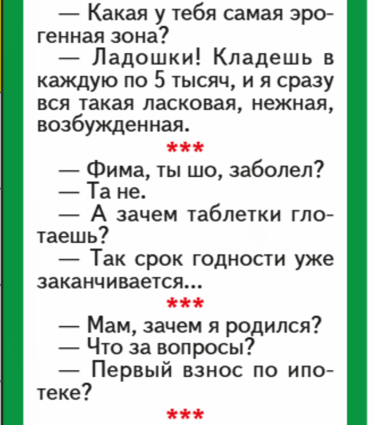 Здравия желаю! Сегодня большой праздник ДЕНЬ ЗАЩИТНИКА ОТЕЧЕСТВА, самое банальное было бы выложить армейские анекдоты. Но.... тема статьи другая, хотя я думаю, что анекдоты нашим мужчинам и ТАМ выживать помогают, а это уже ДЕЛО ДЕЛЬНОЕ! Ну, пусть не анекдоты, а просто - юмор, и что в этом плохого? А моё дело, как говорил МАЯКОВСКИЙ "Смешить всегда, смешить везде, смешить - и никаких гвоздей!" Впрочем,.. как это никаких гвоздей?, а как без гвоздей строить? Непорядок, однако. Короче, по порядку: Анекдот - друг человека, а человек - друг анекдоту, если, конечно, у него есть чувство юмора. Так о чём это я? Ага! Главное, ребята, чтобы у человека было чувство юмора — тогда дружба между ним и анекдотом становится по-настоящему крепкой. Если нет чувства юмора, то надо его развивать, строить и оно (чувство юмора) будет своего рода мостом, который соединяет сердца и души, позволяя людям находить общий язык даже в самых сложных ситуациях. Именно благодаря этому мосту анекдоты становятся не прос