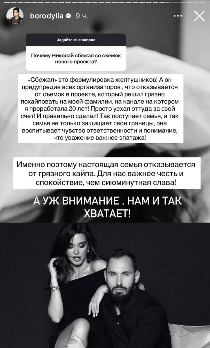 Ксения Бородина еще раз прокомментировала отказ мужа от участия в реалити-шоу из-за Курбана Омарова. Телеведущая рассказала, что Николай не сбежал со съемок «Мастер игры», а заранее предупредил организаторов и вернулся в Москву за свой счёт, так как их семья против грязного хайпа. По словам Ксении, перед ними за эту ситуацию лично извинилась Тина Канделаки. Блокнот Старс в MAX